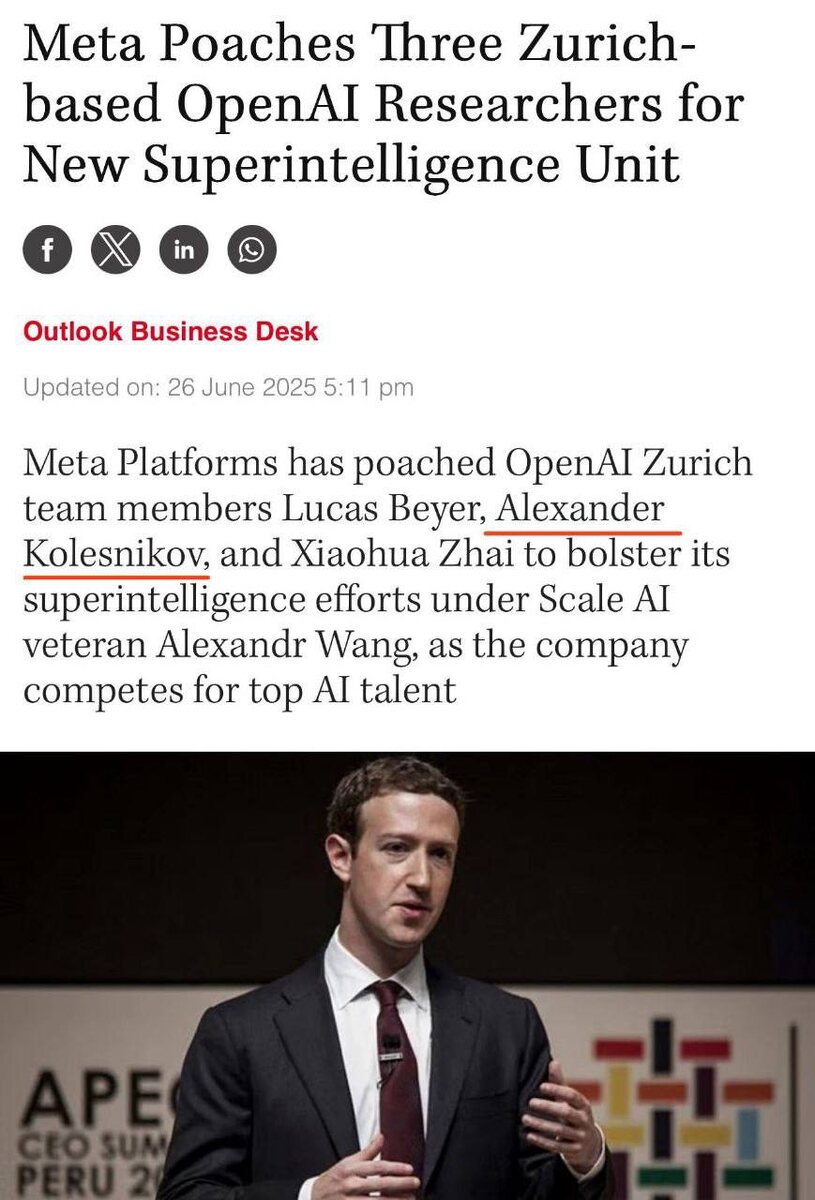 Марк Цукерберг лично привлек в Meta* талантливого выпускника МГУ и двух специалистов из OpenAI. В команду, работающую над AGI, вошли Лукас Бейер, Чжай Сяохуа и Александр Колесников, ранее сотрудничавший с Яндексом.