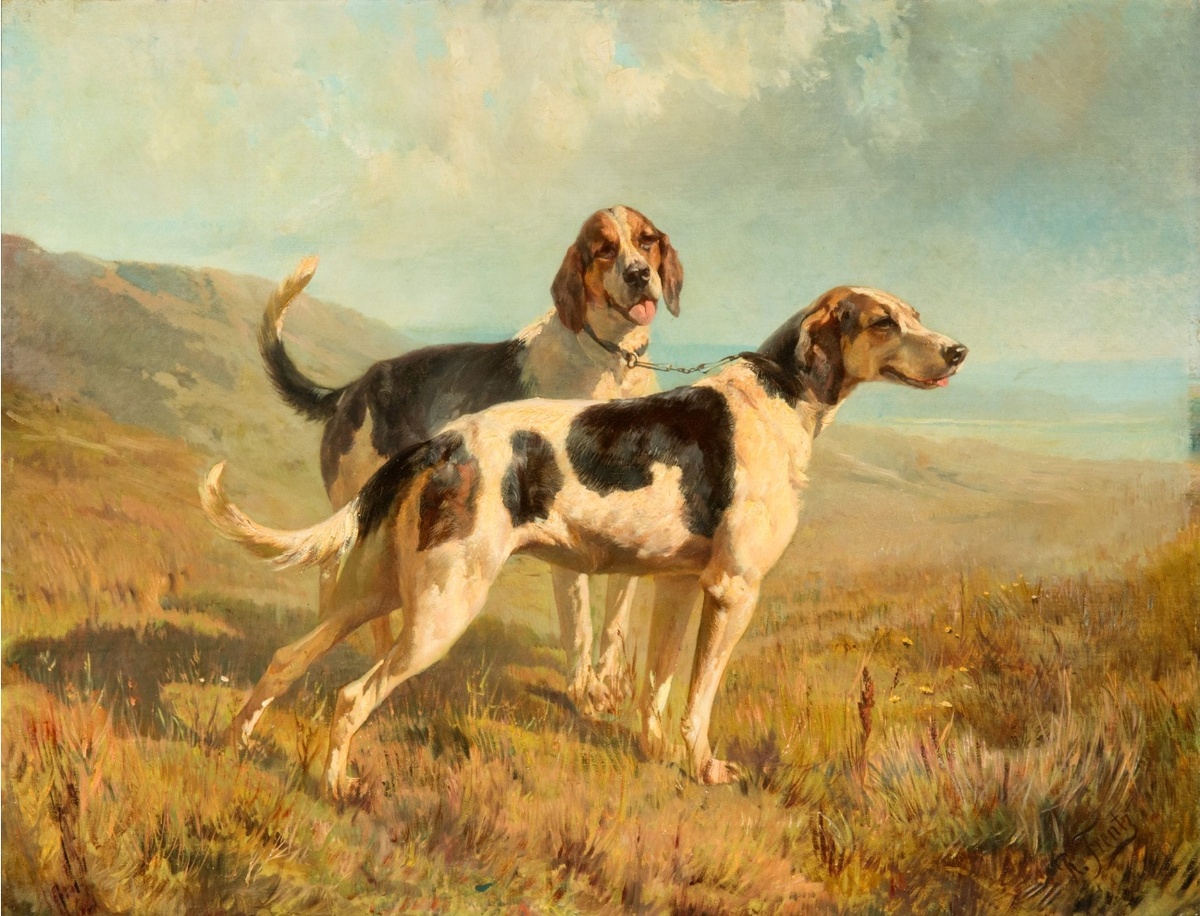 👉 «Две гончие», начало 1870-х годов, Государственный Русский музей, Санкт-Петербург. Эта картина попала в основную коллекцию музея в 1931 из Александровского дворца-музея. Ныне находится в Строгановском дворце, в Зале с дубовым камином. Ее может увидеть каждый из вас в виртуальном туре «АЛЕКСАНДР III. Император и коллекционер». Александр III очень любил псовую охоту и щедро покровительствовал развитию собаководства. У него и его родственников под Воронежем было огромное количество гончих, чье воспитание и навыки были доведены до идеала, но некоторые собаки занимали в его жизни особое место. Например, пёс по кличке Камчатка навсегда остался в его сердце. На картине Френца изображены собаки, с которыми император часто отправлялся на охоту. Современники отмечали, что в течение года император всецело отдавался делам, но в выделенное для охоты время его можно было беспокоить только по чрезвычайным случаям, так как он восполнял недостаток общения с родственниками, любимыми питомцами и семье