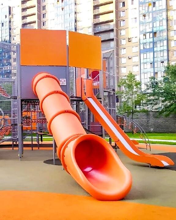 В Калининском районе расположена яркая детская площадка с множеством активностей. Это настоящий двухуровневый лабиринт с канатами, подвесными мостиками и другими интересными элементами. Рядом находится бесплатная уличная библиотека — здесь можно выбрать книгу для чтения или оставить свою для обмена.