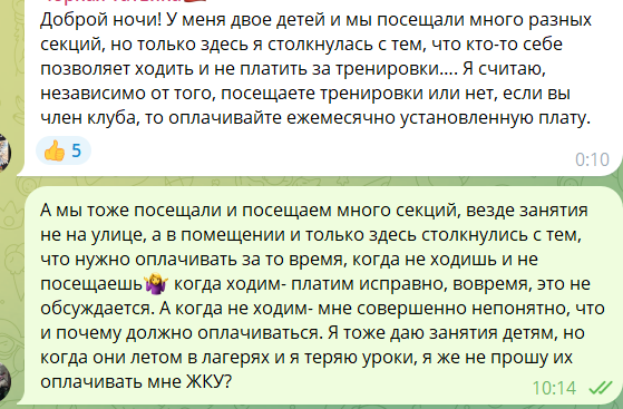Утром смотрю: сообщения в чате. Тренер опять про неоплаты и страдающие от этого зал и его кошелек, а одна мама пришла с инициативой- а пусть те, кто не ходят, все равно платят. Вот три месяца лета они на каникулах- пусть 12 к все равно заплатят.