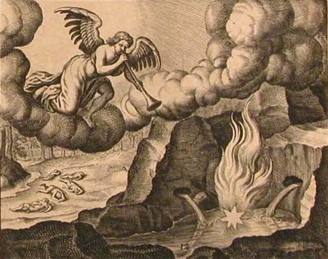 (15) 3—я труба. «…Третий ангел вострубил, и упала с неба большая звезда, горящая подобно светильнику, и пала на третью часть рек и на источники вод. Имя сей звезде «полынь»; и третья часть вод сделалась полынью, и многие из людей умерли от вод, потому что они стали горьки…» (Откр.8:10-11). Светильник символизирует собой слово Божье, а падшая с неба звезда – духовную силу, восставшую против Бога. Здесь сказано, что звезда горела подобно светильнику, т.е. она не являлась истинным светильником, но как бы светильником. Таким образом, звезда эта означает лжепророка, ложный свет, ложное, превратное учение, которое затронет третью часть рек и источников вод, означающих живых верующих и живые духовные церкви. Если предыдущие символы с натяжкой ещё можно было истолковать буквально, то этот уже – нет; как звезда может упасть на множество источников вод и только на реки? Аллегория здесь очевидна. Но что конкретно означает данная звезда? Имя звезде «полынь». Данный образ применяется в Св.Писании