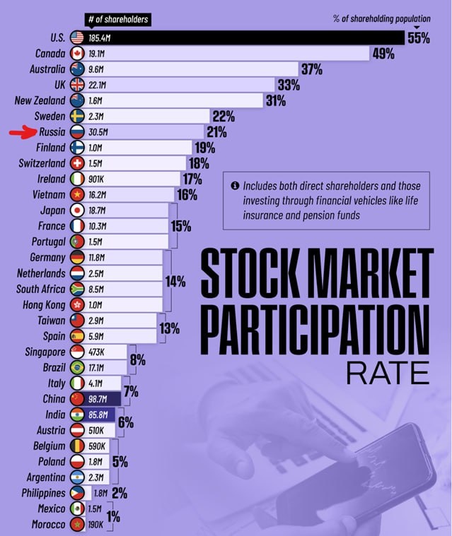 Россия лидирует по доле инвесторов на фондовом на рынке! Россия лидирует по доле инвесторов на фондовом на рынке! Встретил интересную инфографику за 2023-2024 год, касающуюся количества инвесторов на фондовом рынке и их доли в населении страны. Лидером, что и логично, по количеству и доле инвестирующего населения, являются США со 185 млн инвесторов или 55% населения. На втором месте по доле инвестирующего населения идут Канада и Австралия. Что любопытно, Россия находится на 7 месте по доле инвестирующего населения. Сейчас эта доля уже подросла, вчера Герман Греф уверенно заявил, что в России почти 47 млн инвесторов, а это уже практически треть населения страны. Такой заметный рост инвесторов произошел благодаря тому, что доступ к фондовому рынку в нашей стране стал очень простым. Это не может не радовать, т.к. грамотные инвестиции – это путь к финансовой независимости. #фондовый_рынок #деньги #котировки #инвестиции Сообщение [blog.neotorg-line.ru| Россия лидирует по доле инвес