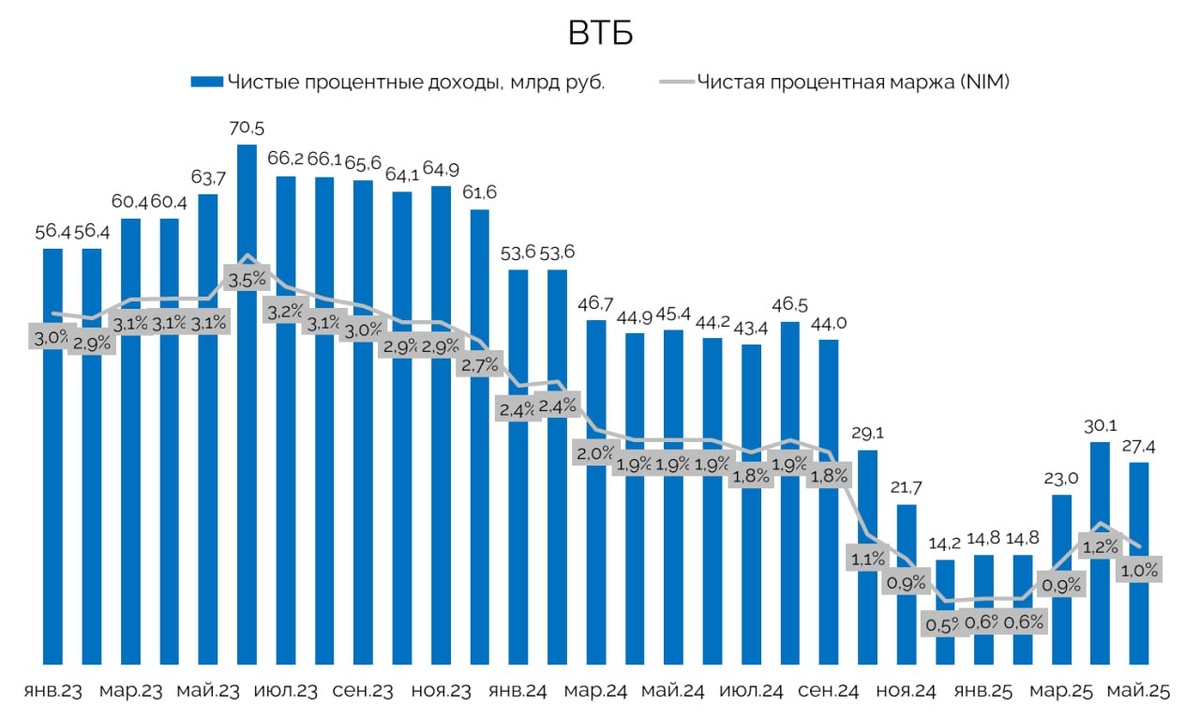 — Чистые процентные доходы снизились в мае на 39,6% г/г как раз за счет удорожания фондирования. Чистая процентная маржа в мае составила 1% vs 1,9% в мае 2024 года.