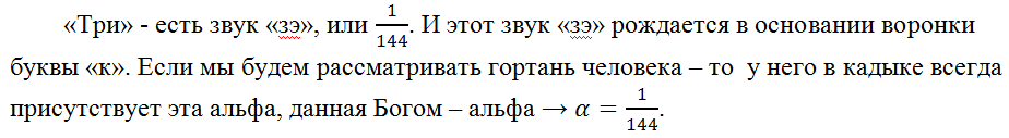 Сам Человек - есть Вселенная. Гортань и рот человека - подобны нашей галактике. В гортани человека, в кадыке, рождаются звуки и слова. Кадык человека – начальная фаза рождения всех звуков. Именно там появляется первый импульс, первое число – «три».