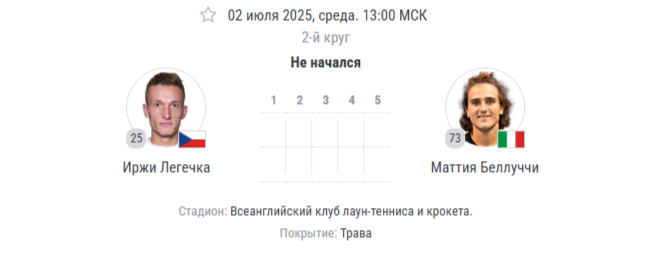 - Риски: Для Легечки — жара (+27°C) может снизить выносливость; для Беллуччи — психологическое давление дебюта во 2-м круге Уимблдона.