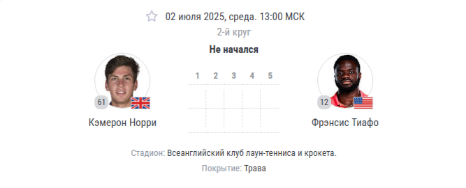 🌡️ Погода: +27°C, солнечно, высокая влажность Тиафо — фаворит матча благодаря подаче, психологическому преимуществу (2-1 в очных встречах) и адаптации к траве, но Норри способен навязать борьбу: Прогноз: Победа Тиафо 3:1 (7:6, 4:6, 6:3, 6:4) при тотале геймов 39–42. Норри покажет характер во втором сете, но мощь подачи №12 мира станет решающей. Прогнозы на этот матч и другие вы можете посмотреть в нашем Телеграмм канале: Ace Bet: Прогнозы на теннис