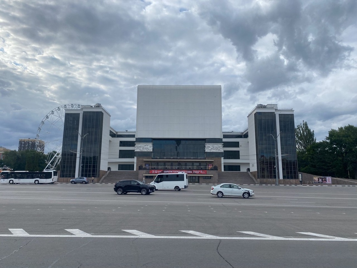 В парковой зоне припаркован гигантский трактор (здание Ростовского академического театра драмы им. М. Горького).