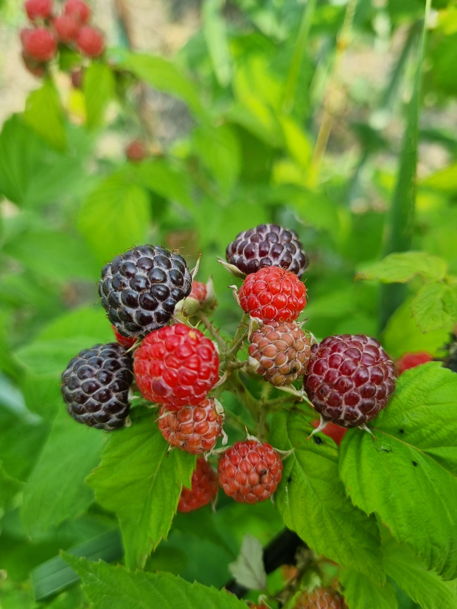 Как-то незаметно пролетел июнь и вот уже июль на дворе! Первый месяц лета выдался хлопотным: тут и досадить, что не взошло, и обработать то, что росло, и убрать и переработать то, что выросло. Клубника и малина уже заканчиваются. Малины у меня нынче мало очень, пока не научилась я ее выращивать килограммами (да и руки до нее никак не доходят, если честно), но черная малина нынче порадовала, было ее много. Буду размножать и по весне рассаживать. Спеет вовсю ежевика. Уже едим первые ягодки и на очереди ее еще очень много. Тоже еще буду увеличивать посадки, пусть ее будет много. Неприхотливая, растет себе и растет. Горох весь убираем уже. Урожай собрали, засолили, наелись до отвала, пора убирать ботву, перепахивать грядку и засеивать ее сидератами. Перец сладкий и острый вовсю едим. Острый сфотографировать не успела, муж унес на плов. Покажу в плове! А сладкий красный - спеет, фиолетовый - вовсю едим. Лук еще не дозрел, чеснок зимний пора убирать, морковь и свеклу тоже пора убирать. К