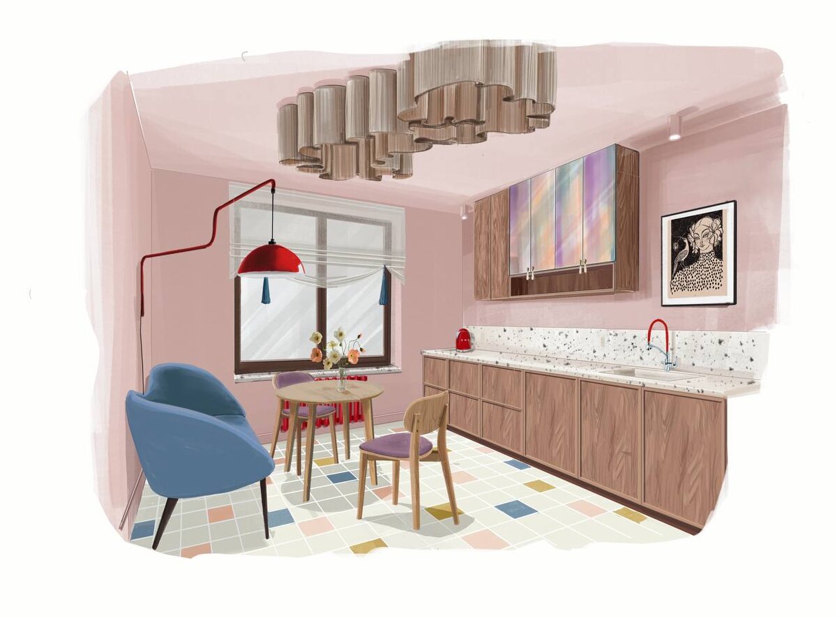 Я себе абсолютно по-другому рисовала в голове дизайн этой квартиры после первой встречи, думалось тут будет сильный налёт ретро, землистые оттенки типа горчицы, оливки и фиолетовый с красными фокусными точками. Но будущая хозяйка домика задала другой тон😊
