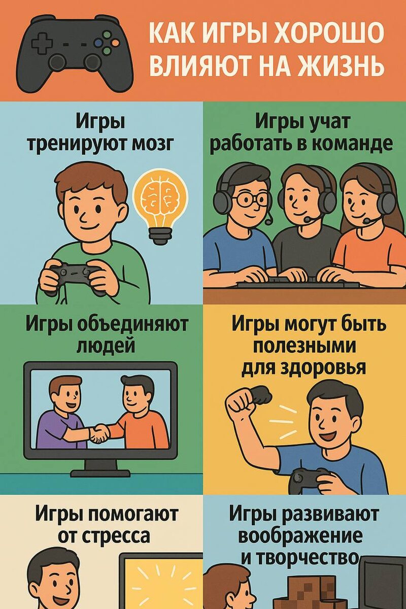 Многие думают, что игры — это плохо. Говорят: «Не играй, это вредно!». Но это не совсем так. Игры могут быть очень полезными! Вот несколько простых причин. ⸻ 🧠 1. Игры развивают мозг Когда мы играем, мы думаем, запоминаем и учимся. ✅ В головоломках решаем задачи. ✅ В стратегиях планируем наперёд. ✅ В экшенах быстро реагируем. Пример: • «Portal» — учит решать сложные головоломки. • «Civilization» — помогает планировать на много ходов. Игры — тренировка для мозга! ⸻ 👥 2. Игры учат работать в команде Во многих играх нужно работать вместе с другими. ✅ Делимся планами. ✅ Помогаем друг другу. ✅ Учимся слушать и говорить. Пример: • В «Fortnite» или «Valorant» команда должна координироваться. • Это полезно в жизни — на учёбе и на работе. ⸻ 🌍 3. Игры объединяют людей Игры помогают заводить друзей. ✅ Можно познакомиться с людьми из других городов и стран. ✅ Есть большие сообщества по интересам. ✅ Общение даже для застенчивых людей. Пример: • Игровые форумы. • Онлайн-друзья, с которыми играеш