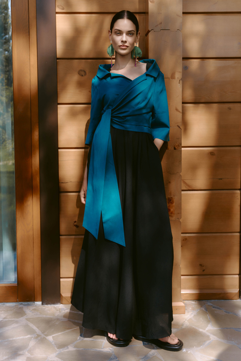 Кто знает меня давно, угадал, что я зацепилась за цвет, но помимо цвета в этой блузе есть масса уникального, такого, чего в других брендах вы не найдете. Во-первых, деликатно, утонченно и очень женственно открытые плечи (а женственность – самый яркий и очень объемный по выражению тренд, который не выйдет из моды в ближайшие 5 лет). Во-вторых, крой на запах с длинным поясом-завязками, которые можно завязывать десятком разных способов и каждый раз, меняя ширину запаха и геометрию завязок мы получим разные образы. А ещё эта блуза-жакет может стать стилеобразующей вещью и частью индивидуальаного стиля. И тогда это фактически не просто модная вещь, а вещь, которую можно носить вне моды, но внутри концепта личного стиля. В комплект к блузе есть прямая юбка на запах, которую можно носить саму по себе (тогда возьмите размер побольше, чтобы запах был глубже) или поверх брюк, прозрачной юбки как это придумали дизайнеры LESEL.