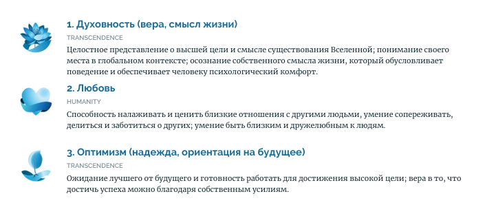 Нашла список 24 добродетелей, который составили психологи Петерсон и Селигман. И он очень согласуется со святоотеческими писаниями. Существует тест VIA-Survey, который покажет иерархию всех этих добродетелей в жизни. Для прохождения нужна регистрация, но никаких активаций не нужно, сразу можно приступить к тесту, причём на русском языке. Этот тест рекомендую всем, особенно кто считает себя «никчемным». Увидев свои сильные стороны, жизнь может заиграть новыми красками и призвать к действию. К примеру, мой топ-3 такой: Можно развивать добродетели, которые ниже по списку, но мотивация будет похожа на мотивацию сопротивления - развивать то, в чем ты слаб. Я бы предложила развивать осознанность в уже и так сильных качествах. Если это духовность, как в моём случае, то актуально Любовь можно расписать на конкретные шаги: Оптимизм можно «прокачать» тоже по шагам: Подписывайтесь, я нахожу удивительные стыки, где святоотеческая мудрость подтверждается современной наукой :)