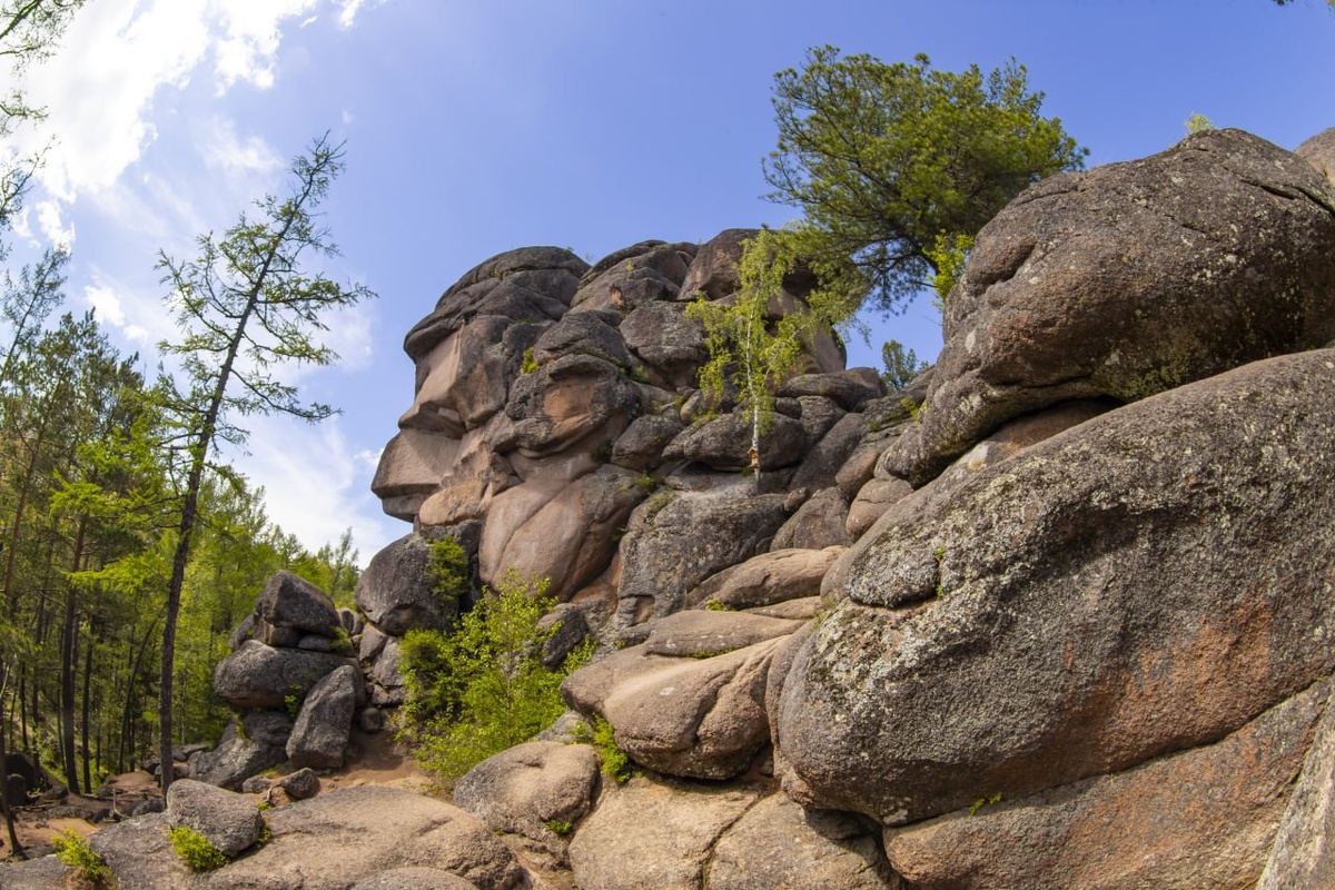 Это не просто лес, друзья. Это огромный заповедник на северо-западных отрогах Восточного Саяна, знаменитый своими причудливыми скалами-исполинами. Некоторые из них стоят уже 450 миллионов лет, и почти сто из двух сотен скал имеют свои имена: Перья, Дед, Бабка, Слоник, Львиные ворота... Это настоящие гиганты из сиенита, которые удивляют своими формами и величием.