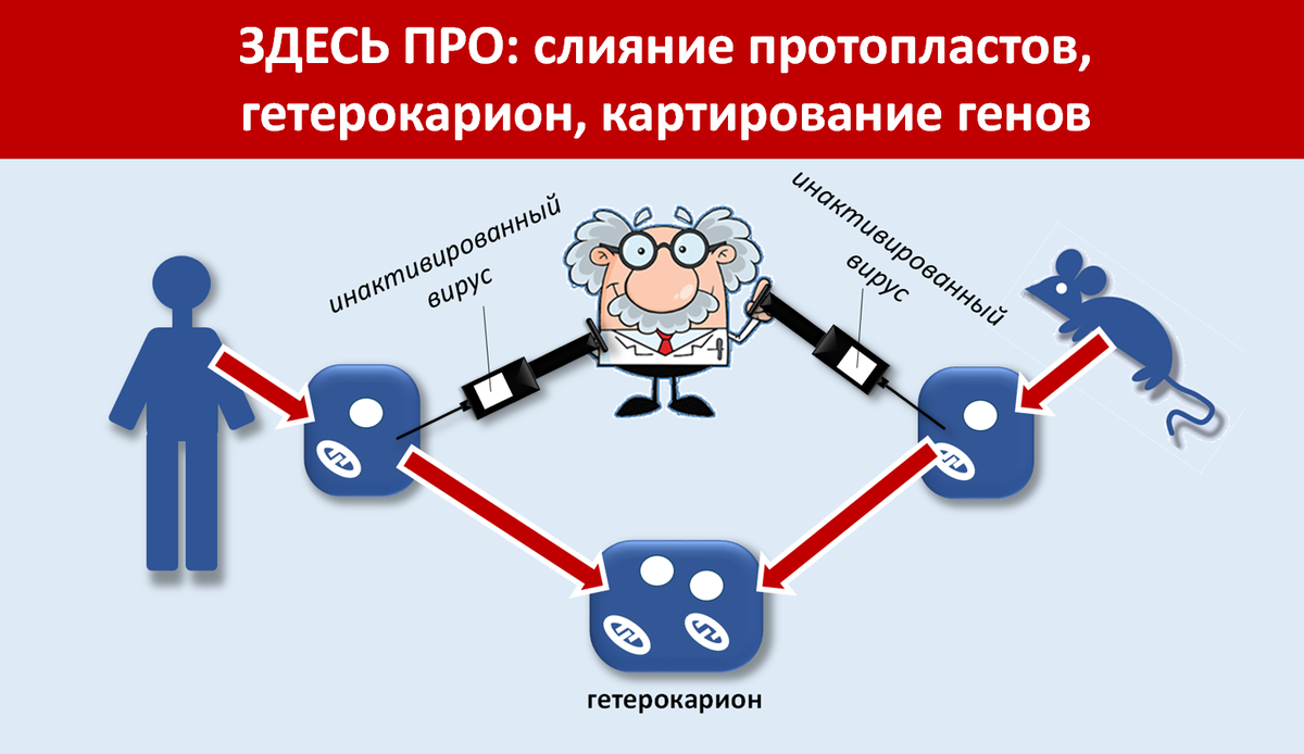 Ну ладно, признаю. Не скрещивали этих двоих, а всего лишь провели слияние протопластов их клеток. Протопласт клетки - это всё её содержимое без клеточной стенки Зачем-зачем... Из научного любопытства, конечно. ЧеловекОмышь при этом не вышла, естественно, а получился гетерокарион (от греч. ἕτερος - «иной, различный»; греч. κάρυον –«ядро») - такая клетка, у которой несколько разных ядер и, соответственно, несколько полноценных наборов наследственной информации. Генри Харрис - тот человек, которому первому пришла в голову мысль скрестить бульдога с носорогом слить протопласты клеток двух видов. Случилось это в 1965 году. 1. Обработал клетки инактивированным вирусом, то есть вирусом, предварительно измученным до такой степени, что продырявить мембраны клеток мыши и человека он сумел, а вот внедриться в них и заразить - уже нет. Через отверстия в клеточных мембранах содержимое разных клеток слилось друг с другом. 2. После этого в распоряжении экспериментатора оказались вот такие варианты
