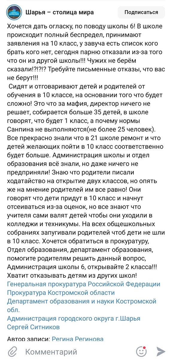 Прокуратурой на основе публикации в сообществе «Шарья — столица мира» организована проверка о нарушении прав учащихся в Шарье