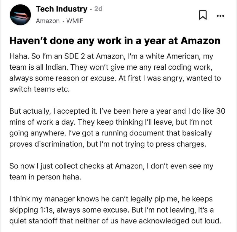 🤔 "ИГРА В ИНДУСА": КТО КОГО ПЕРЕСИДИТ? Представь: ты попал в команду, где тебе не дают задач, но продолжают платить 16 тысяч долларов в месяц. Скучно? Возможно. Но наш герой, разработчик из Amazon, решил не сдаваться и превратил эту ситуацию в мастер-класс по прокрастинации. Почему это важно? Это пример того, как неправильная тактика может обернуться в пользу того, кого хотели "выдавить". Индусы рассчитывали, что скука заставит его уволиться, но он переиграл их. Как это применимо в жизни? Иногда стоит проявить терпение и использовать ситуацию в свою пользу. Главное — не терять мотивацию и находить способы оставаться продуктивным, даже если обстоятельства против тебя. Смотри скрин – там всё наглядно 😉 Жми 👍, если бы тоже так сидел на работе! #Amazon #Работа #LifeHack | ВСЁ ПРО AI | AI NEWS | Дзен | ОК