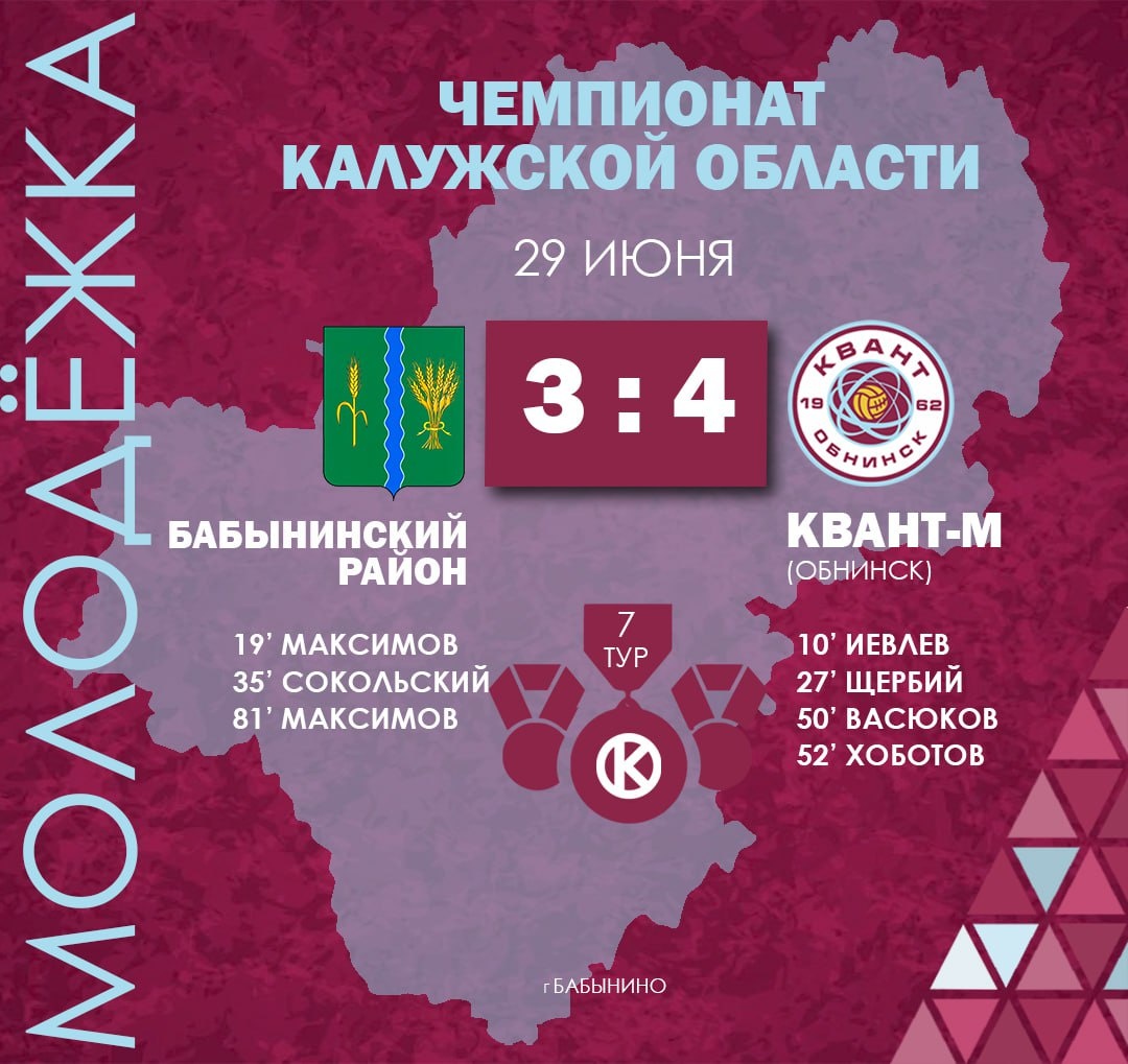 Пока основа пропускала минувший тур, очередную игру в Чемпионате Калужской области провела молодёжка. Квант-М на выезде одолел команду Бабынинского района со счётом 4:3👏. Голами отметились Иевлев, Щербий, Васюков и Хоботов. Также скажем об Азамате Джумаеве, который записал на свой счёт 4 голевые передачи💪
