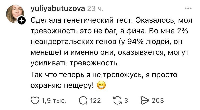 Оказывается, тревожность — не баг, а фича. Бегом делать ДНК-тест и охранять пещеру. Подробнее: https://hard-tm.su/threads/99232/ 🕹HARD-TM — Подписаться