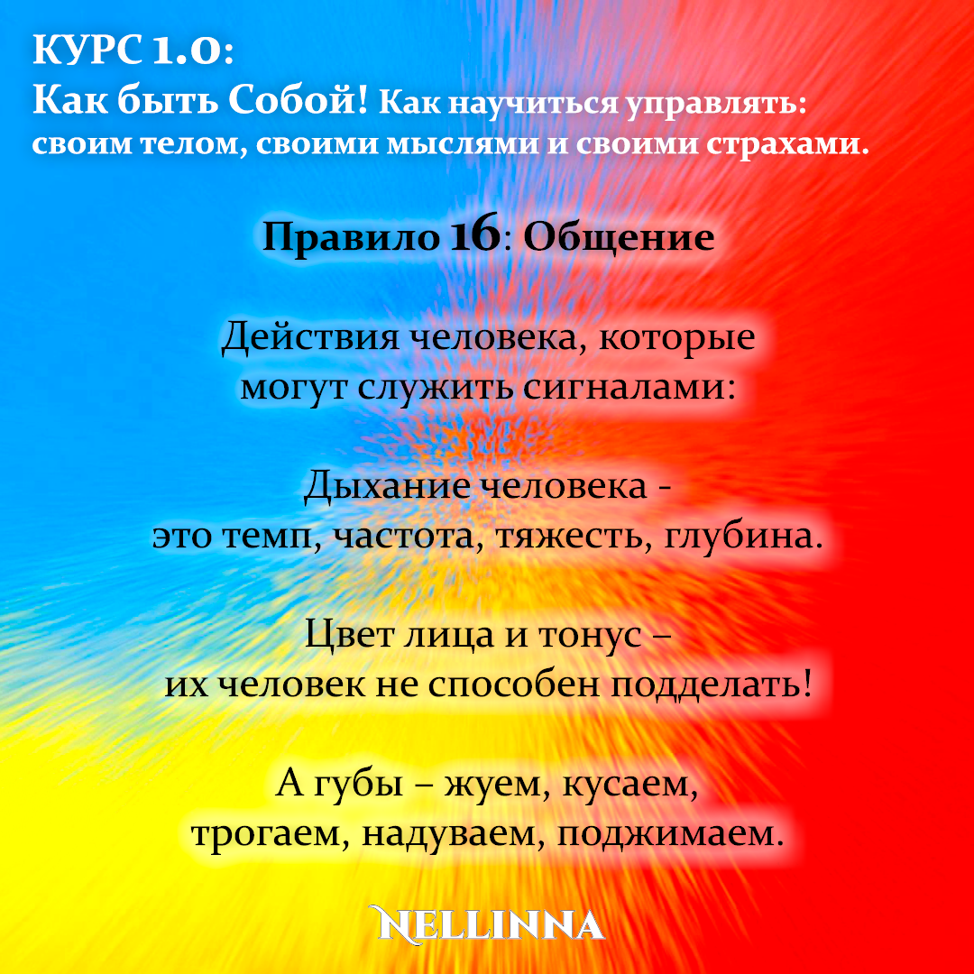 Правило 16: Действия человека, которые могут служить сигналами: Дыхание человека - это темп, частота, тяжесть, глубина. Цвет лица и тонус – их человек не способен подделать! А губы – жуем, кусаем, трогаем, надуваем, поджимаем. Не пытайся общаться по единому шаблону с разными людьми, т.к. необходим индивидуальный подход к каждому человеку. Читая человека, нужно подобрать к нему особый код, уникальный ключ и специальный подход. Чтобы не пропустить следующую публикацию – Подписывайтесь! И делитесь полезной и бесплатной информацией! #курс #тренинг #обучение #практикум