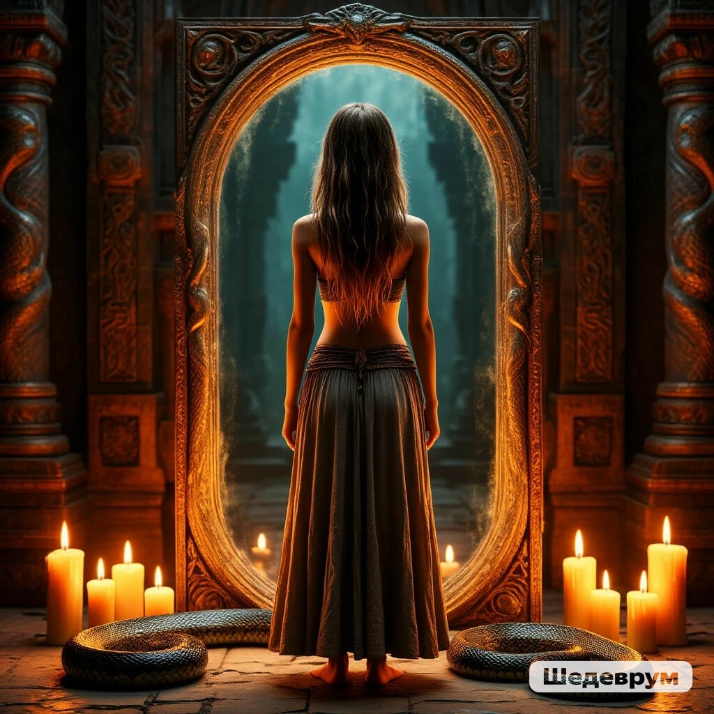 - Позже я почувствовала легкое прикосновение, словно кто-то слегка подтолкнул меня к плечу. Это ощущение заставило меня обернуться, и я увидела за спиной огромное зеркало, которое тянулось от потолка до пола. Оно было старым и потрескавшимся, словно хранило тайны потустороннего мира. Его отражение было мутным от времени, и четко увидеть себя в этом таинственном зеркале было почти невозможно.