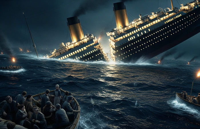 Внезапно огни на пароходе гаснут, он погружается во тьму, и только взлетевшая в небо аварийная ракета на мгновенье освещает палубу, на которой начинается настоящая паника. Толпы испуганных пассажиров устремляются к спасательным шлюпкам, которых на борту «Титаника» оказывается всего двадцать на более чем две тысячи пассажиров. Возле шлюпок происходит давка, звучат призывы пропускать вперед только женщин и детей, многие люди падают в ледяную воду, цепляются за края шлюпок или разбросанные вокруг деревянные предметы и быстро погибают от переохлаждения.