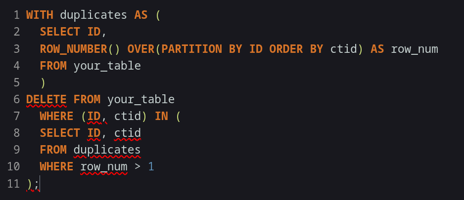 Вот несколько эффективных способов удалить дубликаты строк в таблице PostgreSQL, сохраняя только одну запись для каждого уникального ID: WITH duplicates AS ( SELECT id, ROW_NUMBER() OVER(PARTITION BY id ORDER BY ctid) AS row_num FROM your_table ) DELETE FROM your_table WHERE (id, ctid) IN ( SELECT id, ctid FROM duplicates WHERE row_num > 1 ); CREATE TABLE your_table_new AS SELECT DISTINCT ON (id) * FROM your_table ORDER BY id, some_timestamp_column; -- можно указать критерий для выбора какой дубликат оставить DROP TABLE your_table; ALTER TABLE your_table_new RENAME TO your_table; DELETE FROM your_table WHERE ctid NOT IN ( SELECT MIN(ctid) FROM your_table GROUP BY id ); DO $$ DECLARE batch_size INTEGER := 10000; BEGIN LOOP DELETE FROM your_table WHERE ctid IN ( SELECT ctid FROM ( SELECT ctid, ROW_NUMBER() OVER(PARTITION BY id ORDER BY ctid) AS rn FROM your_table ) t WHERE rn > 1 LIMIT batch_size ); EXIT WHEN NOT FOUND; COMMIT; END LOOP; END $$; SELECT id, COUNT(*) FROM your_table GROU