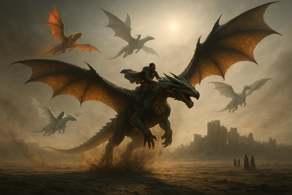 Пыль еще не успела осесть на камнях Южной площади, а пять исполинов уже готовились подняться в воздух впервые как единый отряд. Эльридан решил не медлить: драконы, измученные долгим пленом и утренним обрядом, нуждались в свободе полета, а люди — в том, чтобы привыкнуть к новым ролям. К полудню, когда солнце стояло в зените над обугленными башнями Академии, он собрал свою четвёрку всадников на просторном плато за городскими стенами. Когда-то здесь располагались университетские сады, теперь же поле почернело от пепла и было пустынно: идеальное место, чтобы учиться летать, не подвергая риску горожан.
