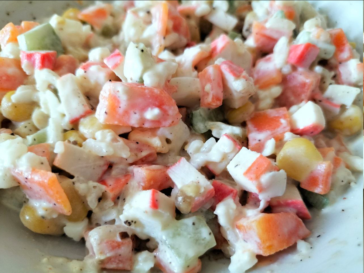 Салат за 10 минут. Рецепт с рисом, крабовыми палочками, кукурузой