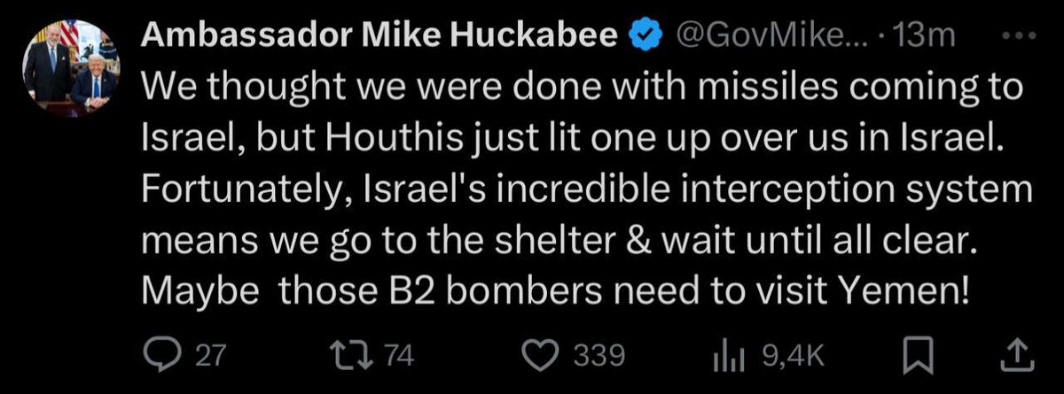 US Ambassador to Israel Huckabee casually floats B2 BOMBER strike on Yemen