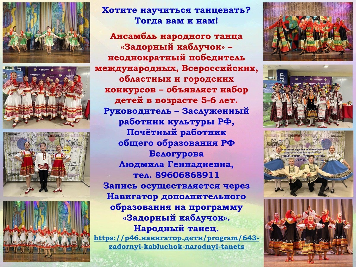 Хотите научиться танцевать? Тогда вам к нам! Ансамбль народного танца «Задорный каблучок» – неоднократный победитель международных, Всероссийских, областных и городских конкурсов – объявляет набор детей в возрасте 5-6 лет. Руководитель – Заслуженный работник культуры РФ, Почётный работник общего образования РФ Белогурова Людмила Геннадиевна Запись осуществляется через Навигатор дополнительного образования на программу «Задорный каблучок». Народный танец. https://р46.навигатор.дети/program/643-zadornyi-kabluchok-narodnyi-tanets #образованиеКурск #образование46 #ДПШ