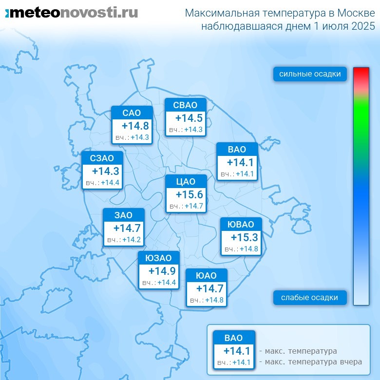 #за12часов #день Прошедший день 1 июля оказался на 0.2°C теплее вчерашнего. Максимальная температура днём в Москве была на 9.3°C ниже нормы, что значительно холоднее, чем обычно. Самая высокая температура +15.6°C была зафиксирована в 15 часов в центре города, а холоднее всего было на западе: +12.6°C. Разница по максимальной температуре в разных частях столицы составила за день 3°C. Максимальные порывы ветра днём достигали 9 м/с. Атмосферное давление за день повысилось с 733 до 738 мм.рт.ст. На большей части территории города прошли небольшие осадки. Больше всего осадков выпало на юго-востоке города – 4.7 мм. Самый теплый день в Москве 1 июля был в 1898 году, когда максимальная температура составила +32.6°C, а холодный в 2006 году: +12.1°C. Перейти на сайт Прогноз погоды на 14 дней
