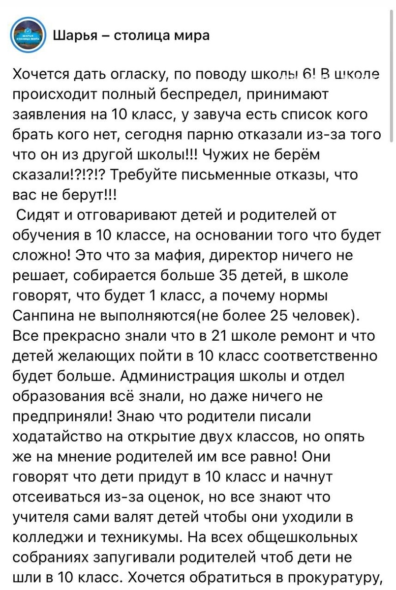Шарьинская межрайонная прокуратура организовала проверку на основании опубликованной в сети Интернет информации о нарушениях прав несовершеннолетних. Родители детей, обучающихся в школе №6 Шарьи, пожаловались на отказ переводить детей в 10 класс. Сообщили, что детей не принимают, сформирован список для одного десятого класса.