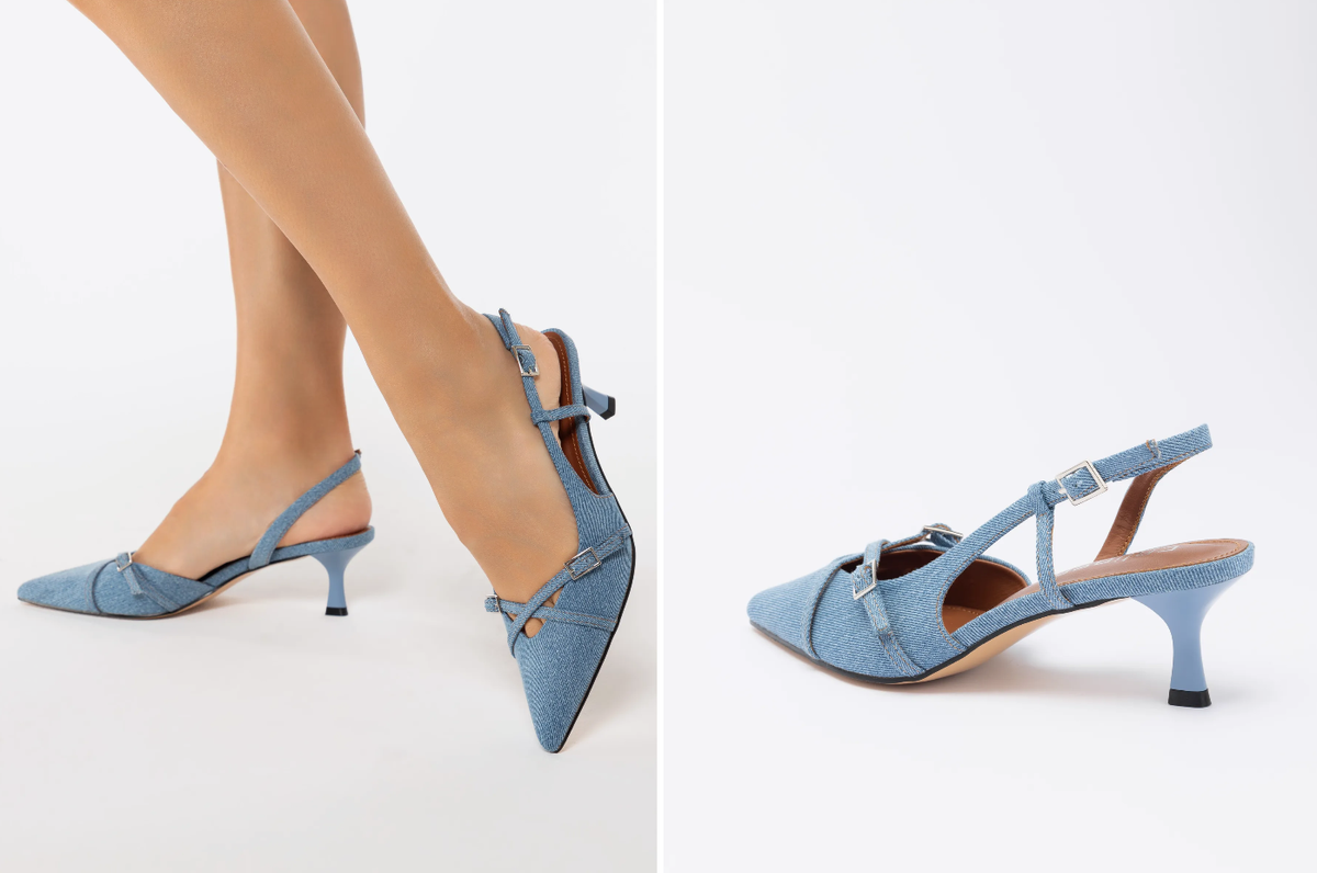Элегантные туфли от бренда Calipso выполнены из текстиля с эффектом голубых джинсов, что делает их стильным акцентом в летнем гардеробе. Открытая пятка и аккуратный ремешок с пряжкой обеспечивают лёгкость и комфорт даже в жаркую погоду, а зауженный мысок визуально вытягивает силуэт ноги. Небольшой устойчивый каблук придаёт образу женственность и подходит для повседневной носки.