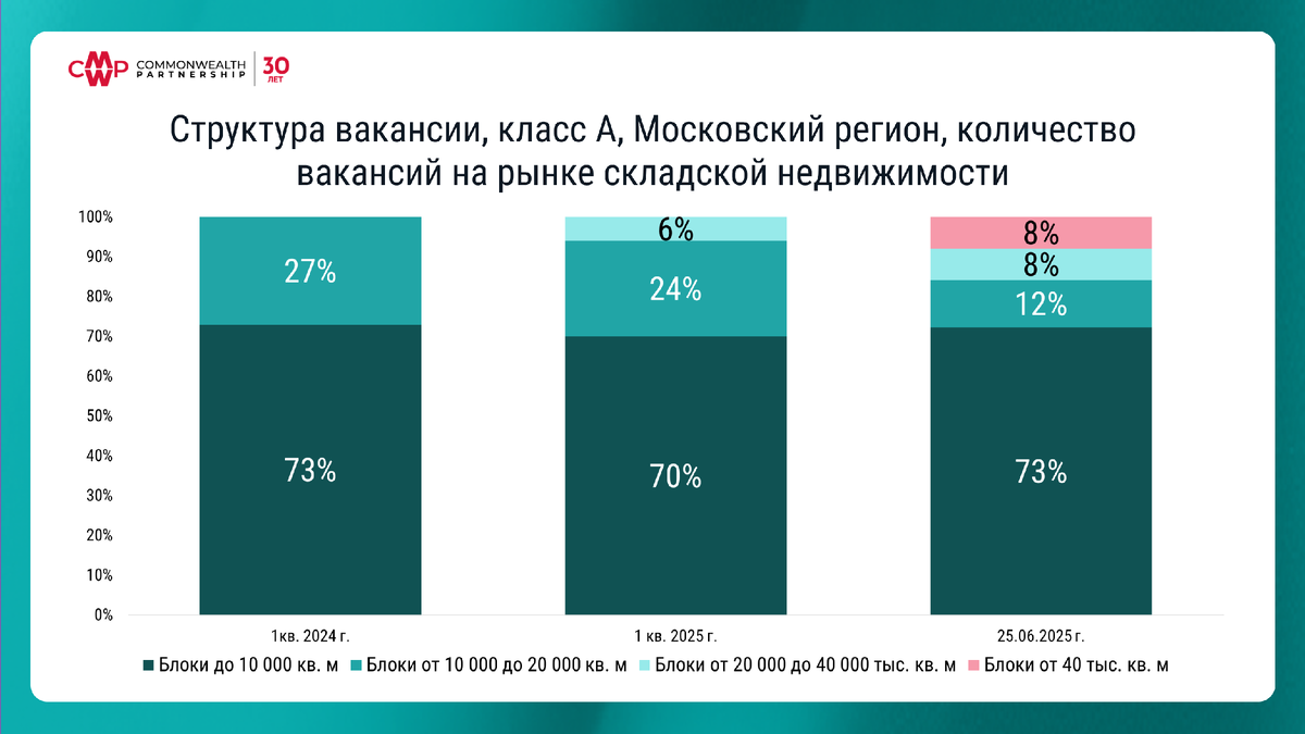 На складской рынок вышли объекты свыше 40 тыс. кв. м, что стало отличительной чертой 2 кв. 2025 г. ➡️ Доля таких предложений в общем объеме свободных площадей в Московском регионе класса А с датой доступа до 25.06.2025 г. составляет 8% (общий объем свободных площадей по состоянию на 25.06.2025 г. составляет 647 тыс. кв. м). ➡️Общий объем предложений (площадью свыше 40 тыс. кв. м) 272 тыс. кв. м, 38% из которых представлены одним объектом. ➡️Разрыв между уровнем вакансии, зафиксированным по состоянию на 25.06.2025 г. и долей свободных площадей с датой доступа в ближайшие 6 месяцев сокращается. Если в предыдущие периоды разрыв достигал более 1 п. п., то на текущий момент показатель составляет 0,6 п. п. Интересно отметить, что разрыв между уровнем вакансии, зафиксированным по состоянию на 25.06.2025 г. и долей свободных площадей с датой доступа в ближайшие 6 месяцев сокращается. Если в предыдущие периоды разрыв достигал более 1 п. п., то на текущий момент показатель составляет 0,6 п. п. Е