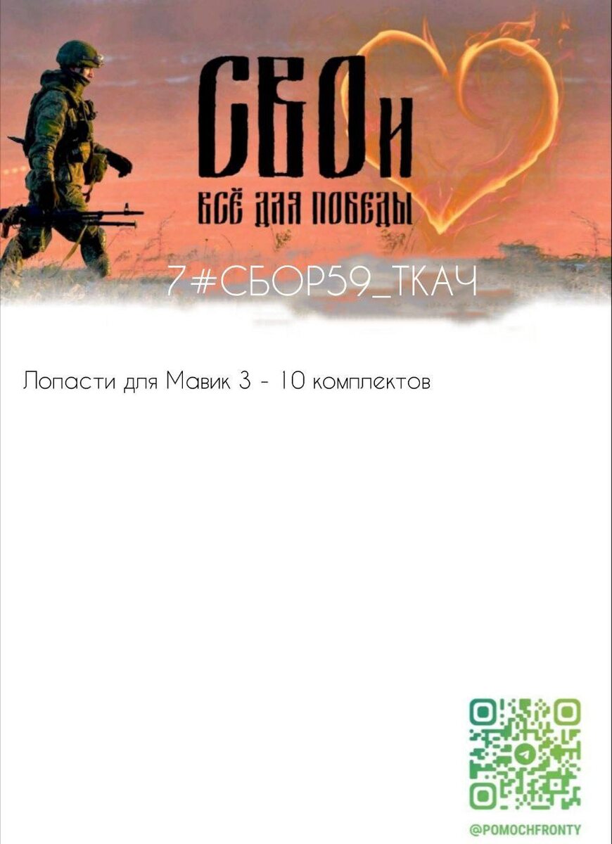 ⚡️😶😶😶😶 для Ткача БПЛА Парни работают на самом краю. Дальше них только враг. Подвоз продуктов бывает редко, берут только то, что нужно для работы. Несут до точки через несколько «пунктов- подвоза» -на себе . Очень скромный запрос. 1️⃣Лопасти для Мавика 10 комплектов * 1800 = 18 000 ❗️Сумма сбора: 18 000 Помочь СВОим ФРОНТ ✅ Т-Банк: 2200701225452439 Тел. для перевода по СБП (Т-Банк): 89936125765 Юлия Ф./Иван П. 🇷🇺У БОГА НЕТ ДРУГИХ РУК, КРОМЕ НАШИХ 🇷🇺