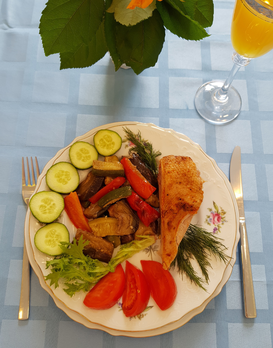 Добрый день, дорогие друзья! Сегодня я представляю вашему вниманию баклажаны, цукини и сладкий перец, замаринованные в соевом соусе и оливковом масле с последующим запеканием в духовом шкафу на режиме гриля. Для приготовления нам понадобятся: 1,2 килограмма баклажанов, 1,4 килограмма цукини, 1 килограмм сладкого красного перца, 100 грамм соевого соуса, 100 грамм оливкового масла, 50 грамм свежего чеснока, 30 грамм мёда, 1 лимон, 1 чайная ложка черного молотого перца. Приготовление: лимон разрезать пополам и выжать из него сок. Смешать соевый соус, мёд, оливковое масло, сок лимона, черный молотый перец. Измельчить чеснок и добавить его в маринад. Нарезать баклажаны сорта «Граффити» брусками. Добавить в баклажаны «Граффити» часть маринада, перемешать. Этот сорт баклажанов меньше впитывает масло. Нарезать брусками «Американские» баклажаны. Перемешать «Американские» темные баклажаны с уже замаринованными баклажанами «Граффити». Нарезать цукини, полить их маринадом, перемешать. Нарезать