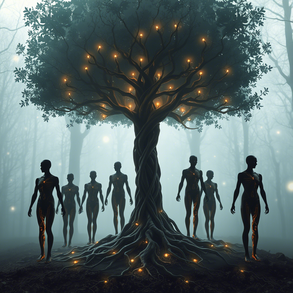 Мы нашли укрытие глубоко в Нижнем городе — там, где старые серверы давно стали частью природы. Здесь выросли деревья, питаемые не водой и солнцем, а остаточными данными и эмоциями людей, которые когда-то здесь жили.