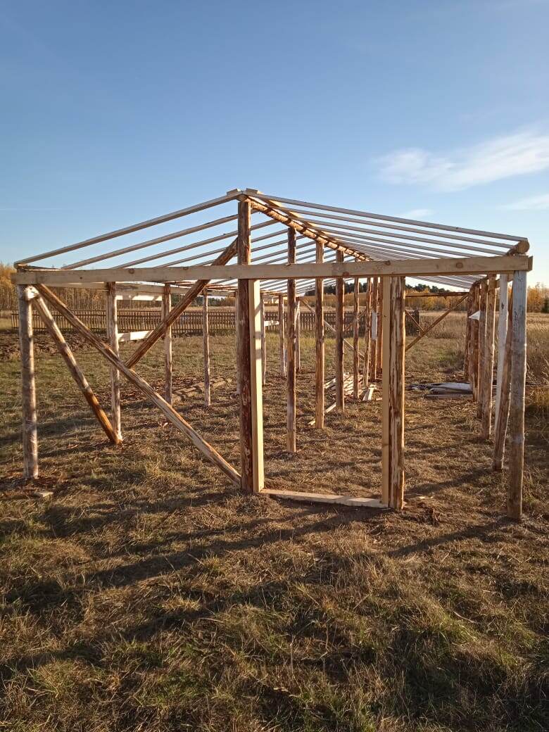 А дальше уже ничто не останавливало полета, кроме количества имеющихся в наличии очищенных от коры бревен, и в итоге размер будущей «теплички» получился 11 на 4 метра!!!!!! Каркас поставлен! Рассаде быть!!!! Но оказалось, что каркас это даже не начало стройки теплицы, а только задумка…..