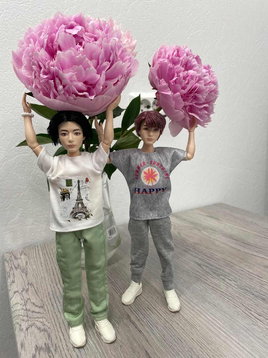 Как мы помним, Тэхён и Чонгук совсем недавно побывали на фестивале пионов, но вот сфотографироваться с самыми красивыми цветами не вышло. И для поднятия настроения они решили купить в магазине букет и устроить свою домашнюю фотосессию. И вот что у них получилось. -Мы купили пионы сорта Сара Бернар, розовые и огромные! -Вот какие огромные! -Только вдвоём можно обхватить цветок! Вот так ребята наслаждались цветами. Всем спасибо за внимание 💜💜💜