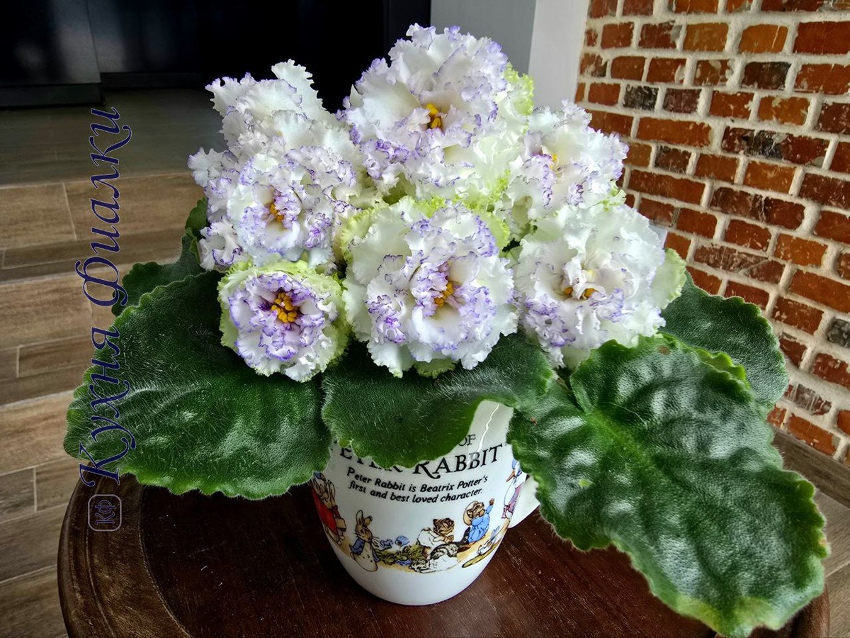Фиалка НК-Рідний Край. Новинка 2022 года. У нас сорт представлен впервые. Гипермахровые белоснежные цветы с прерывистой чёткой каймой и зелёной подложкой. Рано зацвел и, по видимомупоподнит ряды особенно обильноцветущих сортов.