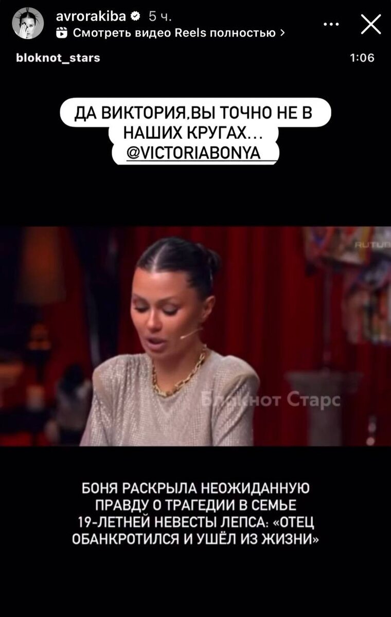 В ответ на пост Аврора Киба разозлилась из-за слов Виктории Бони об её умершем отце. Невеста Лепса опровергла заявление модели, о том, что бизнесмен Илья Беляков ушел из жизни после того, как обанкротился. По словам Авроры, никаких долгов в 25 млн рублей у её семьи нет. «Не нужно раскрывать правду, которую мы сами не знаем. Знаю только, что примерно такую сумму мы тратим за лето, тем более, получив такие комментарии от Виктории, которая далека от кругов общения моей семьи, и всю жизнь находилась в статусе чье-то любовницы, а не журналиста, уж точно!» - высказалась Киба. ⭐️ Блокнот Старс 👨🏻🔧 Объявления работа 🚘 Купи/продай авто