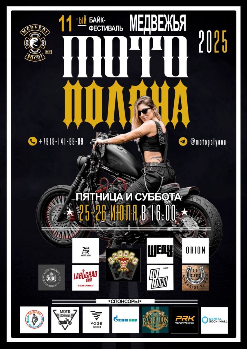 🎉 Приглашаем на 11-й фестиваль «Медвежья Поляна»! 🎉 📅 Дата: 25-26 июля 📍 Место: Курорт Газпром Поляна, 🕓 Начало в 16:00 🚨 Главное мотособытие года в Сочи! Два дня свободы, рёва моторов и живой музыки в горах! В программе фестиваля: 🎸 Живые выступления рок-групп 🔥 Шоу-программа и тематические конкурсы 🍖 Зоны еды, бар и лаунж 🎁 Сувениры и байкерский мерч Участники: Джокер, Лабуград, ШЕДУ, ПАРНИ, The Soul, ORION, Culturo band и др. 📍 Место проведения: Курорт "Газпром Поляна", Сочи 📆 Даты: 25 и 26 июля 2025 🎫 Билеты от: 1300 📞 Контакт: +7 (918) 141-89-89