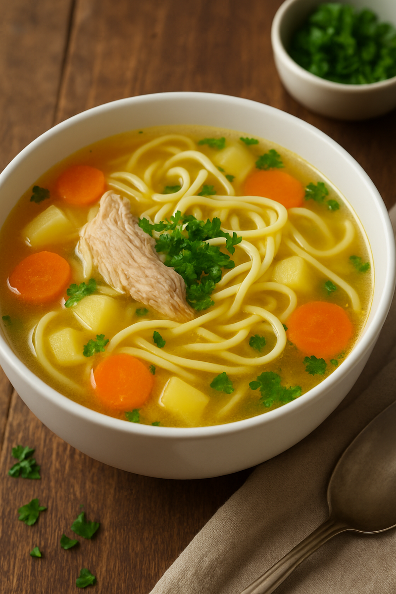 Куриный суп с лапшой — это не просто блюдо. Это аромат детства, тепло домашнего очага и лучшее лекарство от хандры. Он может быть лёгким и диетическим или наваристым и сытным, с прозрачным бульоном или с густой заправкой. В этой статье я расскажу вам, как приготовить куриный суп с лапшой тремя разными способами — классическим, деревенским с домашней лапшой и азиатским с нотками имбиря и чеснока. Каждый рецепт будет пошагово расписан, с точным количеством ингредиентов, чтобы вы с первого раза получили именно тот вкус, к которому хочется возвращаться снова и снова. Идеальный вариант для повседневного обеда Шаг 1. Подготовка бульона Куриные бедра хорошо промойте, положите в кастрюлю, залейте холодной водой. Доведите до кипения на среднем огне. Когда появится пена — снимите её шумовкой. Добавьте лавровый лист, перец горошком и немного соли. Варите на медленном огне 40–45 минут. Шаг 2. Овощи Морковь нарежьте кружочками или соломкой, лук — мелкими кубиками. Картофель очистите и нарежьте к