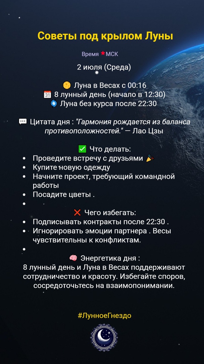 🕊️ 02.07.2025 — число дня: 9 «Энергия завершения, сострадания и духовного роста» Сегодня Вселенная напоминает: Не всё должно продолжаться вечно. Иногда отпускание — это победа. Число 9 приносит в этот день: ✔️ Завершение старых дел и ситуаций ✔️ Глубокую интуицию и духовную ясность ✔️ Силу прощения и сострадания ✔️ Призыв к служению и помощи другим 💎 Что делать: ✅ Подведи итоги — что пора закрыть? ✅ Отпусти то, что больше не служит тебе ✅ Направь свою энергию во благо — даже маленькая доброта сегодня важна ⚠️ Осторожно: Избегай жертвенности без меры. Ты можешь помочь другим, только сохранив баланс внутри себя. 💫 Сегодня день говорит: Закрой одну дверь — и следующая обязательно откроется.