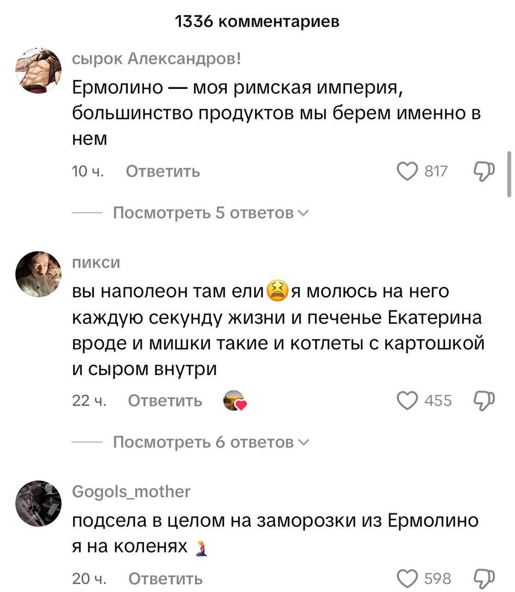 Зумеры открыли для себя бренд Ермолино. Их еду называют шедевром РУССКОЙ кухни и личной римской империей, причём россиянам нравится вообще весь ассортимент — от печенья, эклеров и наполеона до куриных котлеток и блинчиков. Закупаемся только в Ермолино 😸