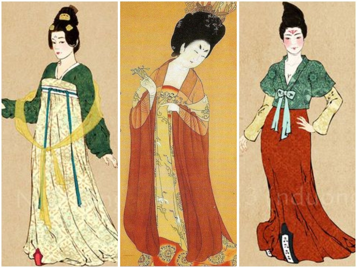 Наряды, пожалуй, самое незамысловатое в образе танской красавицы. В те времена женщины носили топ и длинную юбку, которую завязывали чуть выше груди, поверх одевали рубашку или халат. Кроме того, к наряду прилагался шарф. Ткани должны были быть лёгкими, летящими, струящимися, иногда даже полупрозрачными. Мода того времени была под сильным влиянием космополитической культуры, женская одежда постепенно становилась все более свободной и откровенной. Ткани были шелковые, хлопковые(часто более дорогие, чем шелк, так как в основном хлопок был привозной, только к концу IX века в Китае появилось хлопководство), льняные или шерстяные.