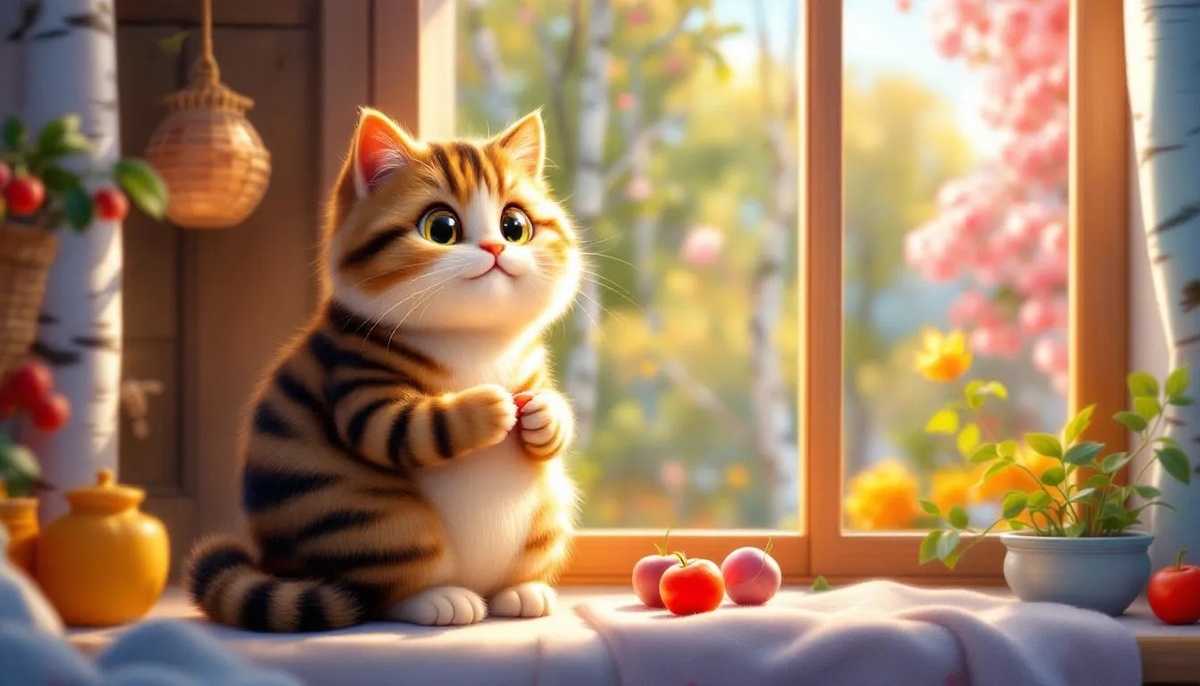 В одном далёком уголке, где берёзы шелестят, а чай всегда горячий, жила-была кошка Матрёшка. Почему Матрёшка? Да потому что была она круглая, полосатая, с румяной мордочкой и такой степенной походкой, что сама баба Клава говорила: — Наша Матрёшка — как настоящая царевна: важная, в мехах и при своём уме. Матрёшка жила в деревне Подберезовка, в доме на краю — том самом, где вишня растёт через окно, и печка гудит даже летом. Хозяйка у неё была добрая — тётушка Соня, бывшая учительница, а теперь — хранительница рецептов и травяного чая. Однажды утром Матрёшка проснулась и почуяла неладное. Тепло исчезло. Не в смысле, что печка остыла — печка гудела. А уют ушёл. Тот самый, от которого усы щекочет, а лапы сами укладываются в клубочек. Она обошла дом. Проверила под одеялом, за самоваром, даже заглянула в хлебницу (мало ли). Всё было на месте — а уюта нет. — Мур-р... странно, — сказала она.