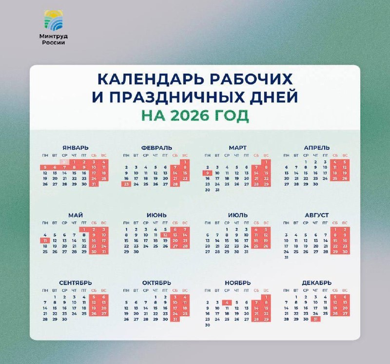 🗓Минтруд показал, сколько россияне будут отдыхать в 2026 году — новогодние каникулы продлятся 12 дней. ✍✍✍ТУТ✍🗞🗞ЗДЕСЬ🗞 ⚡️BOOST КАНАЛА⚡️