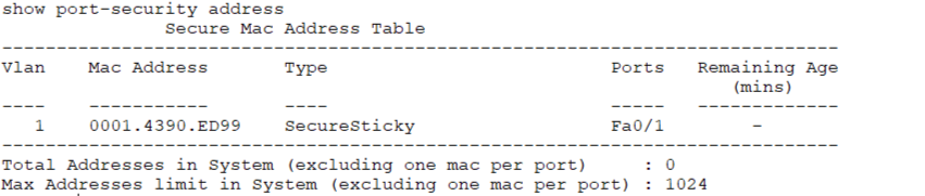 Switch(config-if)# switchport port-security mac-address sticky//Автосохранение MAC