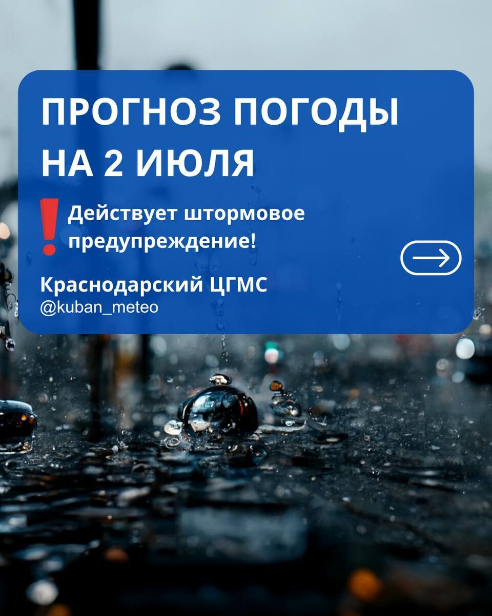 🌧 2 июля в Краснодарском крае действует штормовое предупреждение. Ожидается комплекс метеорологических явлений: в отдельных районах — сильный дождь в сочетании с грозой. С заботой, Краснодарский ЦГМС @kuban_meteo 💙